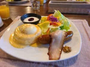 エッグベネディクトに、手作りの無添加ソーセージとベーコン