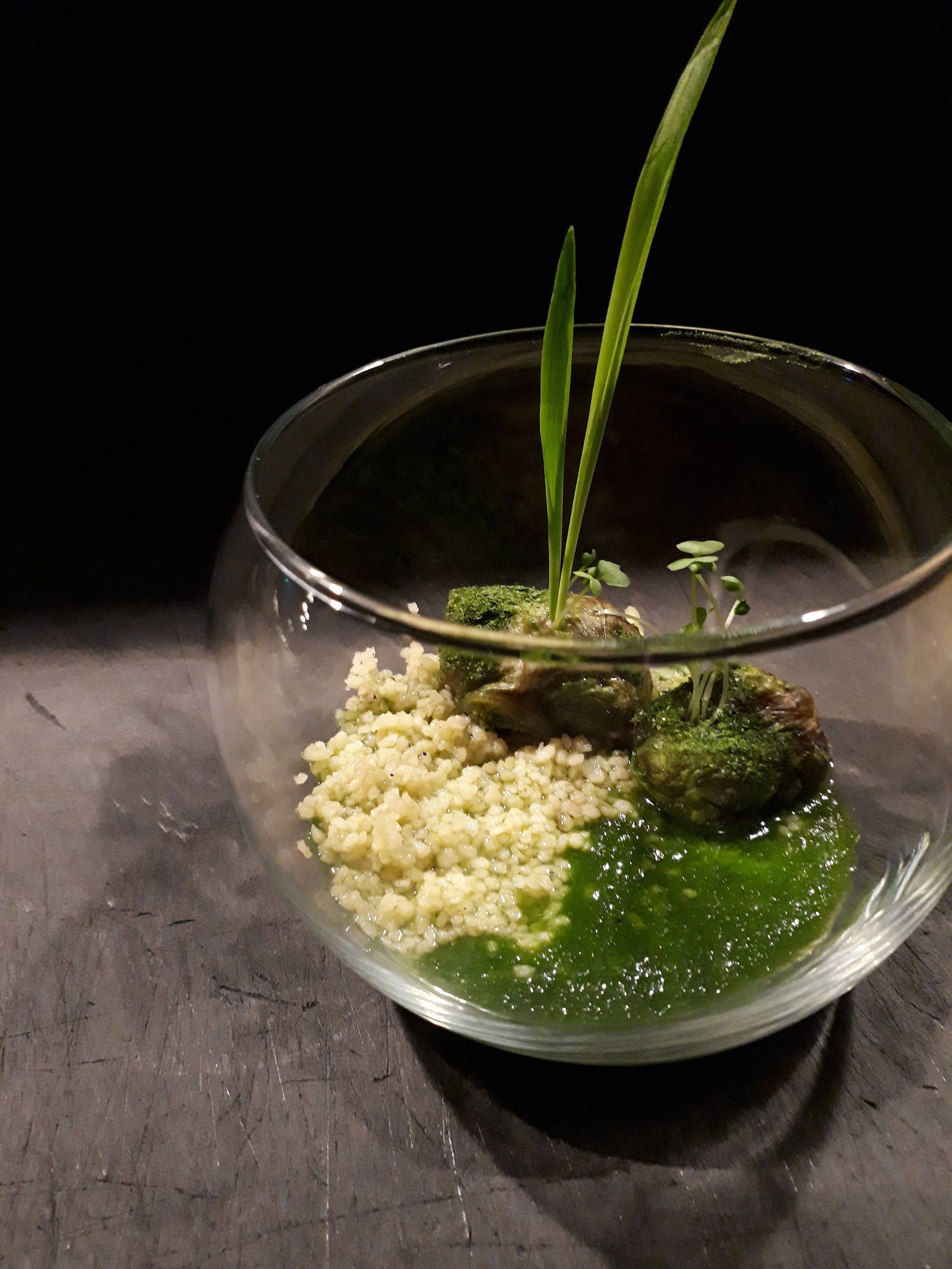 「アカジンミーバイとシークヮーサー泡、カリフラワーピューレ、海ぶどう、醤油、山形ののし梅」
